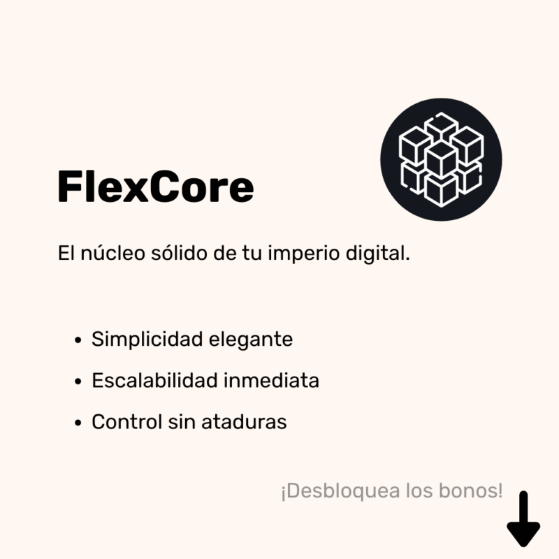 Con FlexCore, no solo adquieres un sistema funcional: obtienes tranquilidad y confianza, sabiendo que tu operación digital está respaldada por un diseño profesional y detallista que garantiza resultados consistentes y visibles. Tu negocio se fortalece, y tú puedes tomar decisiones estratégicas con la seguridad de que todo está funcionando de manera óptima.